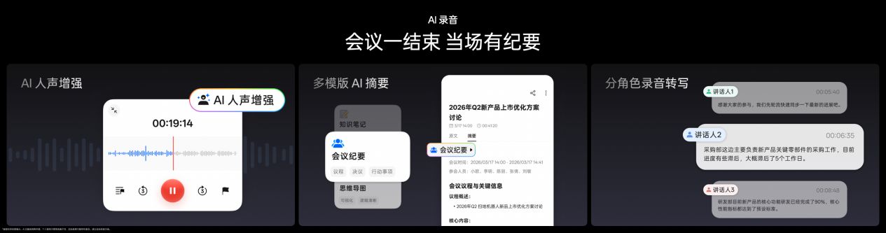 系统级的AI一键闪记、AI录音摘要功能,可快速提取音视频、文档关键信息,精准区分发言人并生成智能会议纪要,大幅提升办公效率。此外,新机还实现原生级跨生态互联,打通Windows、Mac及苹果设备,同时带来便捷的手车互联功能,让多设备切换更顺畅。