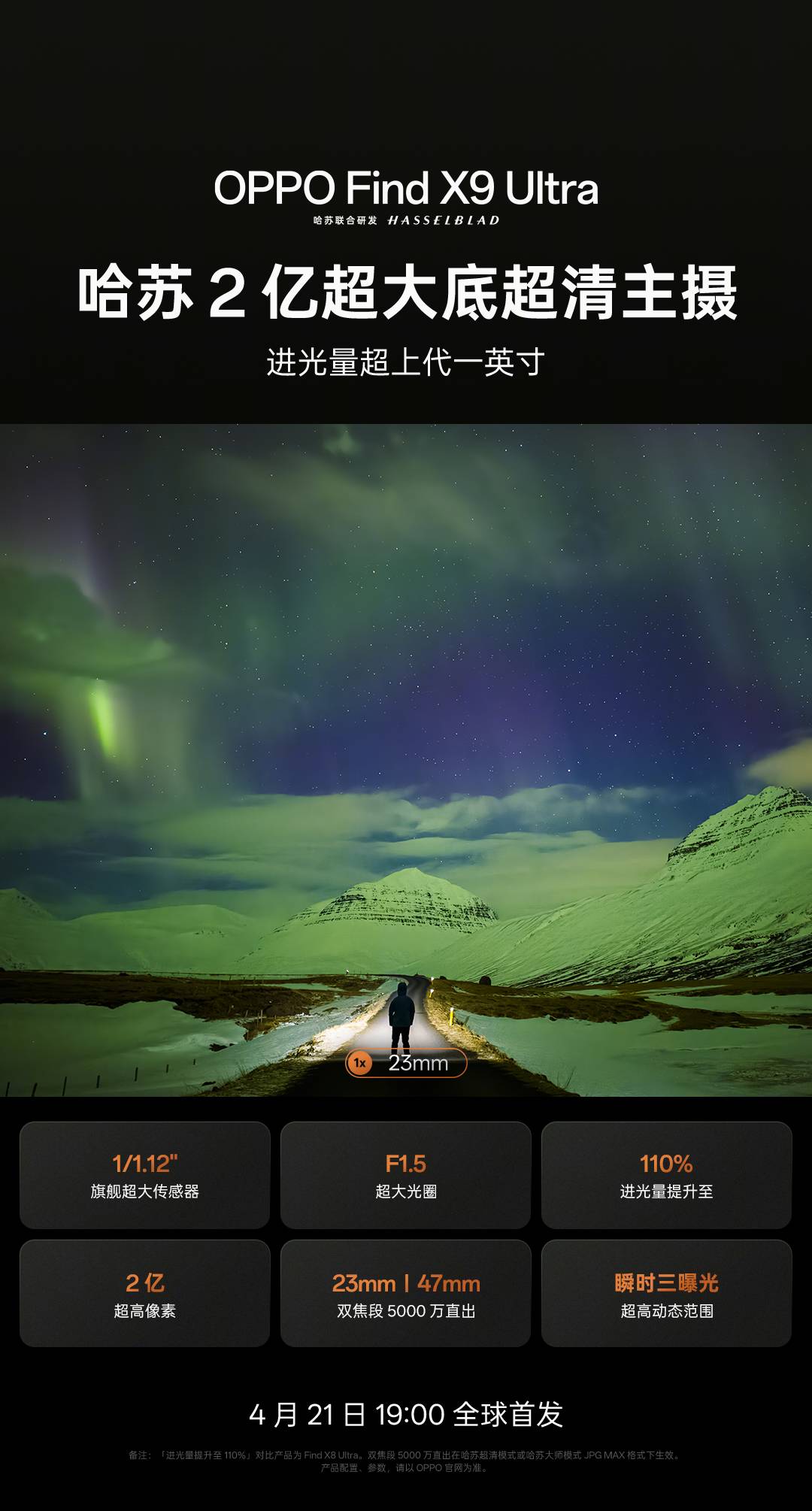 全面升级的 OPPO Find X9 Ultra凭借超完整焦段覆盖、全链路光学优化,乃至哈苏认证的镜头阵列,让哈苏专业影像底蕴能被用户轻松装入口袋,打造 Find X9 Ultra 成为名副其实的「口袋哈苏」,让每一次创作都自然随心、自由无界。Find X9 Ultra 将于 4 月 21 日正式发布,更多产品亮点与详细信息,敬请持续关注 OPPO 官方渠道。