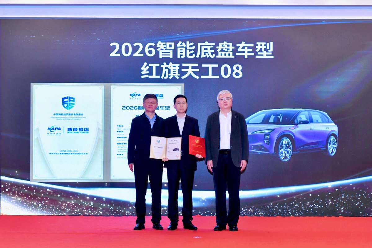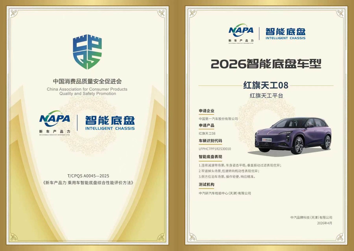 4月18日,在“中国消费品质量安全提升系列行动2026启动暨2026消费品行业系列研究报告发布”活动上,红旗天工08凭借“智、灵、顺、安”的出色表现,顺利通过《新车产品力 乘用车智能底盘综合性能评价方法》权威测评,斩获“2026智能底盘车型”荣誉称号,充分彰显出红旗研发在智能底盘领域的自主研发实力。